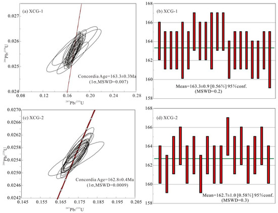 The zircons found in the deep-red quartz monzonite porphyry (sample XCG-02) have a morphology characterized by short- to long-columnar shapes, measuring between 50 and 200 μm in length. The length/width ratio of these zircons ranges from 1:1 to 1:3. The majority of zircons have transparent interiors, high levels of transparency, and distinct rhythmic cathodoluminescence (CL) zoning, as shown in Figure 9b. The zircon LA-ICP-MS U-Pb dating results obtained from XCG-02 are presented in Table 1, with measurements taken at 20 spots on 20 individual grains. The concentrations of U and Th range from 315 to 8959 ppm and 169 to 7123 ppm, respectively. The Th/U ratios range from 0.5 to 1.1. Seventeen locations show agreement in terms of the ratios of 206Pb/238U and 207Pb/235U, taking into account measurement uncertainties. The dates of these locations are mostly concentrated between 161 and 165 Ma, and all of them align closely with or are on the isochronous line. The analyses resulted in a consistent age of 162.8 ± 0.4 Ma (MSWD = 0.0009) (Figure 10c), which closely matches the weighted mean 206Pb/238U age of 162.7 ± 1.0 Ma (MSWD = 0.3, n = 17) (Figure 10d).