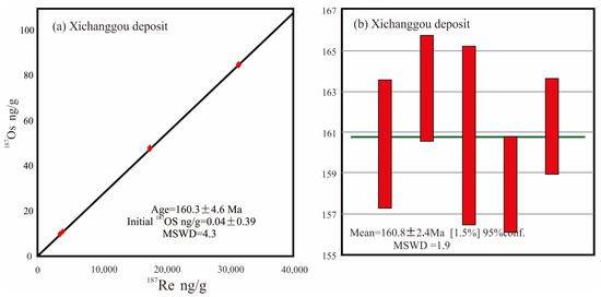 Table 2 presents the findings of five molybdenite samples from stage II, while Figure 11 provides a visual representation of these studies. The samples have varying concentrations of Re, ranging from 5416 to 50,114 ppm. They also have a narrow range of model ages, spanning from 158.4 ± 2.3 to 163.1 ± 2.6 Ma. The 187Re-187Os isochron age is well-constrained at 160.3 ± 4.6 Ma (MSWD = 4.3) (Figure 11a), and the weighted mean Re-Os age is 160.8 ± 2.4 Ma (MSWD = 1.9) (Figure 11b). The absence of a zero-intercept indicates the absence of any measurable common 187Os, implying that all 187Os in the molybdenite are of radiogenic origin. This means that the model ages can be considered credible. Moreover, the concurrence between the isochron age and the weighted average age, taking into account the margin of error, demonstrates the precision of molybdenite Re-Os dating. Hence, the isochron age (160.3 ± 4.6 Ma) employed is the precise time when molybdenite crystallized in the Xichanggou molybdenum deposit.