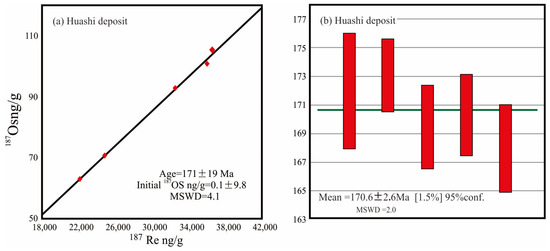 Molybdenite Re-Os isochron (a) and weighted average (b) ages of the Huashi molybdenum deposit.