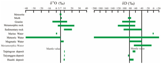 The oxygen and hydrogen isotope findings of the Huashi deposit are documented in Table 3 and shown in Figure 13 and Figure 14. The δDV-SMOW values of Huashi range from −80.0‰ to −67.6‰, with an average of −73.9‰. The δ18O values range from 9.2‰ to 10.5‰, with an average of 9.7‰. The computed δ18OH2O value ranges from −1.86‰ to 2.33‰, with an average of 0.03‰. In addition, we obtained the hydrogen and oxygen isotope data for Taipingcun (data that have not been published) and the Taiyanggou molybdenum deposits. These data can be found in Table 3.