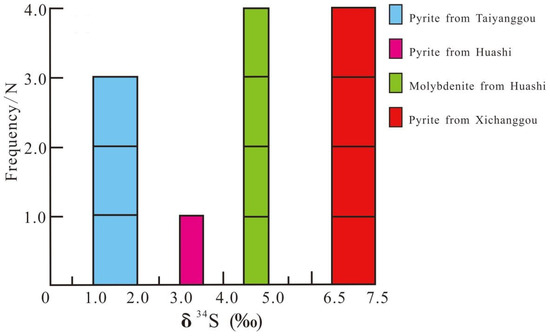 The sulfur isotope composition of metal minerals in the Xichanggou and Huashi molybdenum deposits is particularly concentrated, with both deposits showing a positive and narrow range of variation (Figure 15). The substantial degree of homogenization of sulfur isotopes in the ore minerals of both deposits indicates a single source of sulfur isotopes. Furthermore, the sulfur isotope composition of the Taiyanggou molybdenum deposit we collected exhibits identical traits. The sulfur isotope composition diagram indicates that the δ34S sulfide values of the three deposits are elevated compared to the sulfur generated from the mantle-derived magmatic sulfur (0‰) [40] and are within the range of δ34S values found in granite (5‰ to 15‰) [41]. The uniform sulfur isotope composition observed here indicates that the sulfur isotopes primarily originate from intermediate-acid intrusive rocks associated with mineralization, suggesting a magmatic sulfur source.