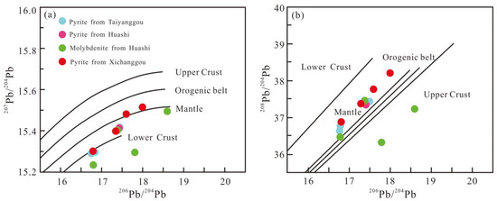 The lead isotopic composition is effective for identifying the origin of minerals that form ore deposits. The presence of trace amounts of U and Th in metal sulfides allows for the determination of the source of ore-forming materials based on their lead isotope composition, mutual relationship, and source characteristic features [42,43,44]. In the graphs depicting the ratios of 207Pb/204Pb-206Pb/204Pb and 208Pb/204Pb-206Pb/204Pb (Figure 16), the majority of samples from the Huashi molybdenum deposit are situated close to the lead evolution line of the mantle and lower crust. Only two samples are found within the upper crust. The Xichanggou and Taiyanggou molybdenum deposits are located close to the lead evolution line of the mantle and lower crust. This suggests that the metal minerals in these deposits mostly originate from a combination of crust and mantle materials. This finding is consistent with the result suggested by the sulfur isotope.