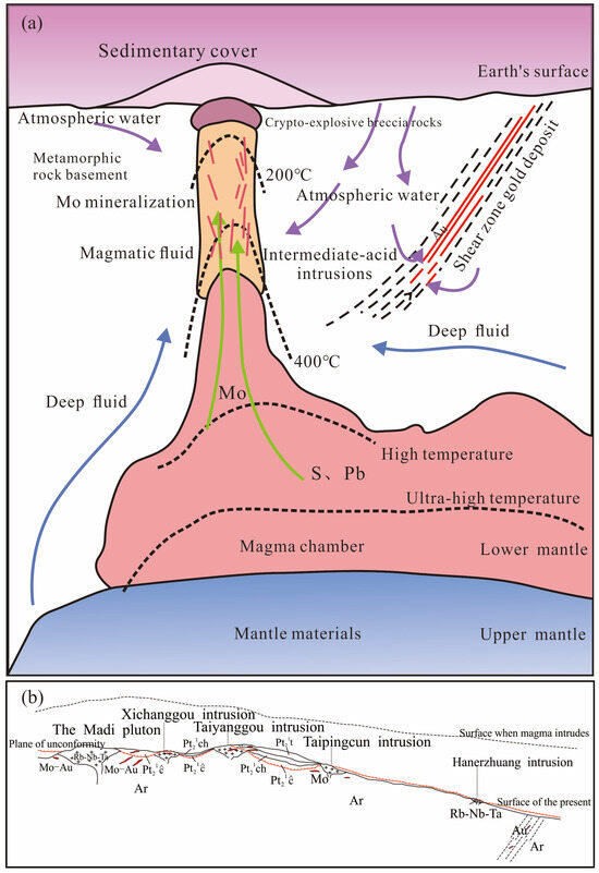 The magmatic activity in the area is characterized by intense intrusive activity, predominantly occurring during the early Jurassic period. In the southern region, the Madi alkali feldspar granite is visible, and in the northern region, the Wangpingshi monzonitic granite is visible. Simultaneously, the area also has a variety of Proterozoic-Archean and Mesozoic dikes. The Madi alkali feldspar granite exhibits a strong genetic association with the Huashi molybdenum and rare metal deposits. The Madi alkali feldspar granite occurs as rock strains covering an area of 5.35 km2. The Madi alkali feldspar granite penetrated the hornblende plagioclase gneiss through at least two intrusion events. The central part of Madi has an age of 175.5 Ma, whereas the peripheral area has an age range of 156–165 Ma [19].