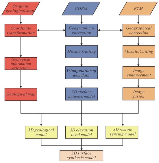 The construction process entails a series of meticulously planned operations including coordinate transformation, georeferencing, and cropping (Figure 2). These procedures were meticulously executed to enhance the visual quality of imagery within the geographical coordinates of longitude 90–91° E and latitude 45–46° N using ENVI software. Simultaneously, we conducted the digital processing of a geological map of Urumqi City at a 1:200,000 scale. The spatial coordinate systems of the digitized geological map, remote sensing images, and DEM elevations were harmonized. Ultimately, the ArcScene platform was employed to retrieve and analyze the spatial data, resulting in the establishment of a comprehensive surface model (Figure 3). Scholars have advocated the application of the constrained Delaunay meshing method to model intricate surface undulations and simulate gravity anomalies within intricate geological formations. Moreover, another group of researchers [149] have utilized digital geological mapping and modelling techniques to produce versatile cross-sectional representations, facilitate dynamic updates, and generate geological interfaces, thereby presenting substantial potential for practical applications (Figure 4).