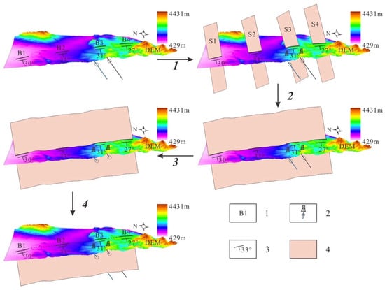 Construction ideas of geological interfaces in digital geological mapping modelling: 1—boundary line and number between points; 2—rock occurrence; 3—drilling; 4—geological interface; 1—the generated segmented geological interfaces based on the boundary between points (B) and corresponding occurrences; 2—the generated geological interfaces based on segmented geological interfaces; 3—boreholes, boundary lines between points, and geological interfaces constrained by occurrence; 4—cutting geological interfaces.