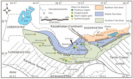 Sketch tectonic map of the western Tien Shan showing locations of major gold deposits (modified from [6,11]).