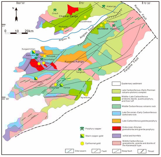 The Kochbulak epithermal gold deposit is located on the northern slope of the Kurama range of the Tien Shan orogenic belt, which represents the world’s second-largest gold province (Figure 1) [5,6,7]. In particular, an array of Late Paleozoic epithermal gold deposits is well preserved in the province [8,9,10]. The geological processes of the Kurama district involved the Late Paleozoic continental arc volcanism, accompanied by the tectonic reworking of the consolidated fold belt [11,12].