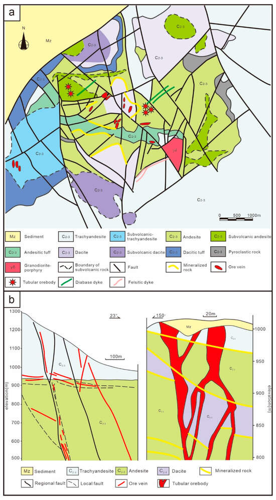 (a) Geological map of the Kochbulak gold deposit. (b) Cross-section of the Kochbulak gold deposit (modified after [13]).