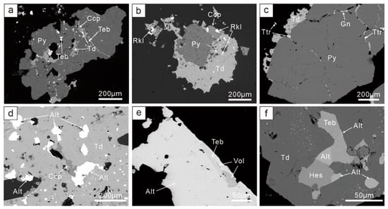 BSE images of typical tellurides of the Kochbulak gold deposit. (a) Tellurobismuthite, pyrite, tetrahedrite, and chalcopyrite. (b) Rucklidgeite, pyrite, and chalcopyrite. (c) Tetradymite, pyrite, tetrahedrite, and galena. (d) Altaite, tetrahedrite, and chalcopyrite. (e) Altaite, tellurobismuthite, and volynskite. (f) Altaite, tellurobismuthite, hessite, and tetrahedrite. Py = pyrite, Ccp = chalcopyrite, Teb = tellurobismuthite, Td = tetrahedrite, Rkl = rucklidgeite, Gn = galena, Ttr = tetradymite, Alt = altaite, Vol = volynskite, Hes = hessite.