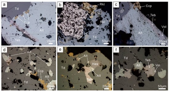 Photomicrographs and paragenetic relationship of typical tellurides of the Kochbulak gold deposits. (a) Tellurobismuthite, altaite, tetrahedrite, and chalcopyrite. (b) Rucklidgeite, pyrite, and chalcopyrite. (c) Tellurobismuthite and volynskite in altaite. (d) Altaite, tetrahedrite, and chalcopyrite. (e) Altaite, tellurobismuthite, and hessite in tetrahedrite. (f) Altaite, tellurobismuthite, and volynskite in tetrahedrite. Py = pyrite, Ccp = chalcopyrite, Td = tetrahedrite, Rkl = rucklidgeite, Alt = altaite, Teb = tellurobismuthite, Vol = volynskite, Hes = hessite.