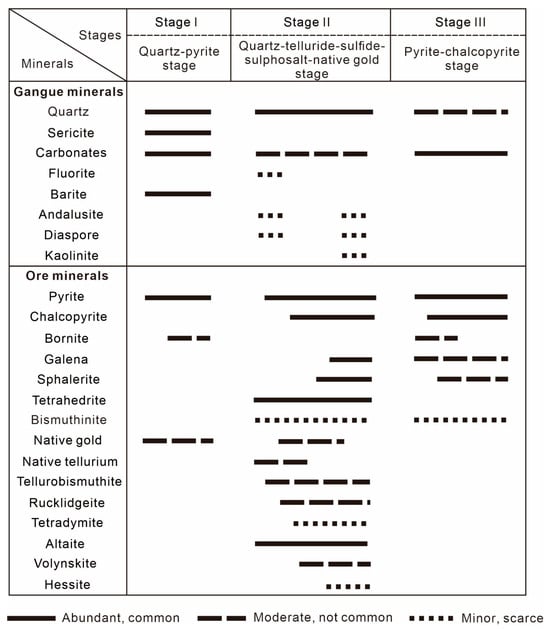 Based on the mineral assemblages and mineral habits, the mineral paragenetic sequence in the Kochbulak deposit can be inferred (Figure 7). Among these, the sequence of mineral assemblages of the second (main) mineralization stage is altaite+calaverite+native tellurium, calaverite+native gold, Bi telluride (e.g., tellurobismuthite and rucklidgeite)+petzite+native gold, Ag-Bi telluride (e.g., volynskite), and Ag-telluride (e.g., hessite)+native gold [4].
