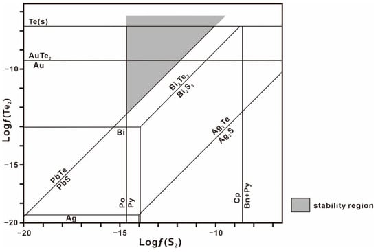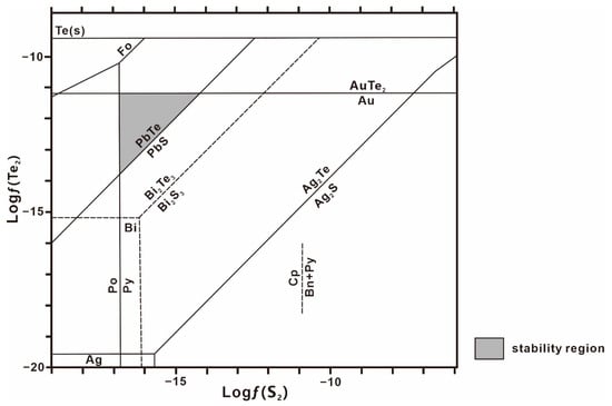 When the temperature drops to 200 °C, pyrite and chalcopyrite still coexist [16], with ƒ(S2) ranging from −16.7 to −10.9. The ƒ(Te2) can be estimated to vary from −13.8 to −11.2, based on the observed coexistence of altaite, tellurobismuthite, and hessite, stable existence of native gold, and a gradual decrease in ƒ(Te2) during deposition (Figure 9).