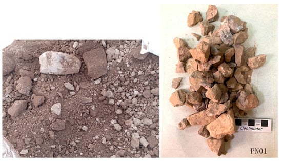 The low-grade high-calcium–magnesium copper–cobalt ore used in this column leaching test was obtained from the Lualaba province in the Democratic Republic of the Congo. The ore consists of a mixture of light red sandstone-like large particles and fine powdery ore, as shown in Figure 1.