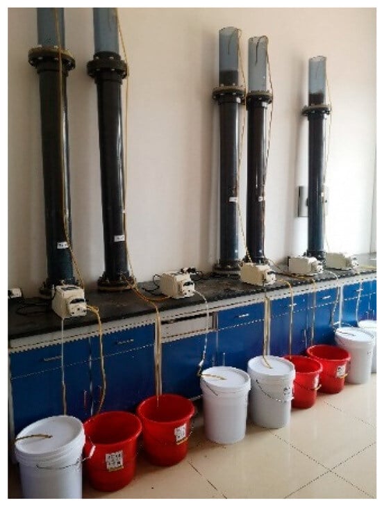 Approximately 40 kg of ore samples were placed in an acrylic column with dimensions of 150 mm diameter × 2000 mm. Gravel was placed at the bottom of the column, and cotton was placed at the top of the ore. During the column loading process, the leaching column was laid down first, and the ore was poured into the column. The column mouth was slightly lifted to allow the ore to slowly slide to the bottom of the column, preventing the ore from becoming compacted and affecting permeability. This process was repeated until the required amount of ore was loaded. Each leaching column was equipped with a pre-leaching solution tank, a post-leaching solution tank, and a constant-flow pump. The leaching solution was quantitatively dripped using a peristaltic pump, with the input/output volume recorded daily. The flow rate of the constant-flow pump was calibrated at regular intervals, and samples were taken to analyze the metal content. The leaching rate and acid consumption were calculated to determine the optimal leaching process parameters.