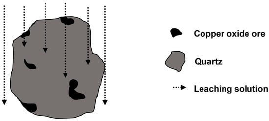 The column leaching process is a complex mass transfer process involving physical and chemical coupling actions such as convection, dispersion, and chemical reactions within the ore heap, presenting a complex dynamic change process. In oxide copper–cobalt ores, gangue minerals are the primary minerals, with valuable components of oxide copper ores constituting only a very small portion. During the leaching process, the solution gradually infiltrates from the surface of the ore to the interior. When the acid-containing solution comes into contact with the oxide copper minerals, the oxide copper will be leached by sulfuric acid. A schematic diagram of this leaching process is shown in Figure 4.