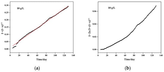 Magnesium column leaching kinetics under H2SO4 of 10 g/L: (a) 1 − (1 − x)1/3; (b) 1 − 2x/3 − (1 − x)2/3.