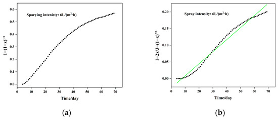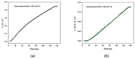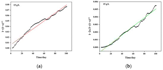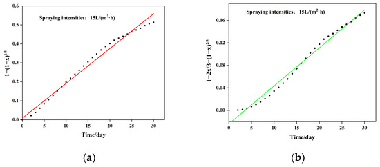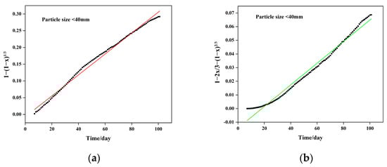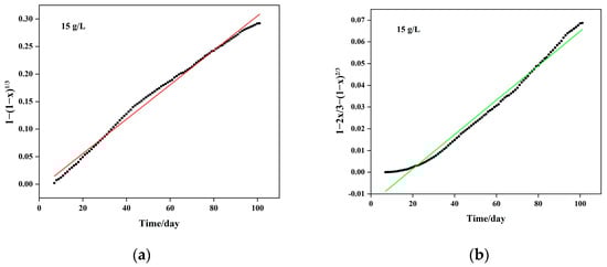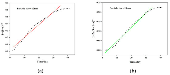 Leaching kinetics of iron during column leaching at H2SO4 of 15 g/L: (a) 1 − (1 − x)1/3; (b) 1 − 2x/3 − (1 − x)2/3.