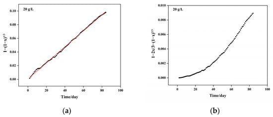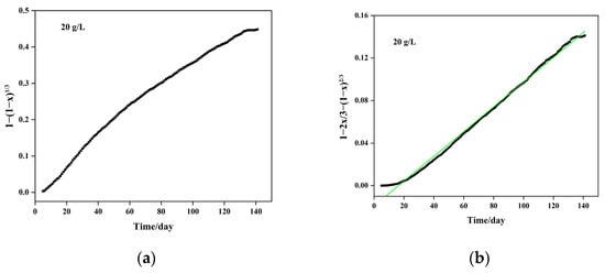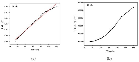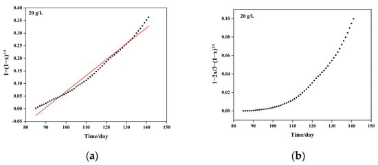 Calcium column leaching kinetics under a sulfuric acid concentration of 20 g/L: (a) 1 − (1 − x)1/3; (b) 1 − 2x/3 − (1 − x)2/3.