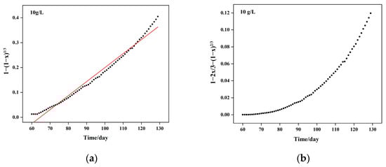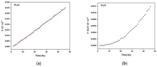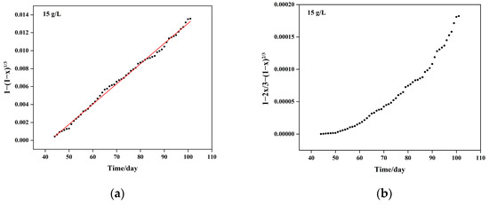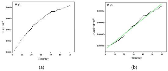 For 20 g/L, from Figure 18a, it can be seen that follows a linear relationship, indicating that the leaching of calcium under this condition is governed by chemical reaction control. The linear fit yields the following chemical reaction control kinetic equation: , with a coefficient of determination of R2 = 0.9798 and an apparent reaction rate constant of per day.