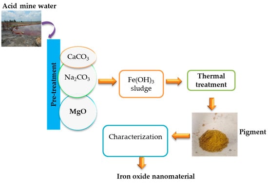 Chemical-based synthesis techniques are the most widely used because of their high yield and cheap cost of manufacturing [59]. According to research by Silva et al. (2019), adding chemical agents to wastewater to increase pH and precipitate dissolved metals in the form of oxides and hydroxides is one way to treat AMD actively [30]. Their research has demonstrated that the iron found in AMD may be used to generate the yellow pigment known as goethite. On the other hand, pigment synthesis may be impeded by the existence of additional metals. In order to recover raw materials from AMD and produce high-quality yellow pigment, they also assessed a number of methods for cleaning iron sludge. Strong and weak bases were used in the studies to induce precipitation, and other metals were extracted from the sludge by centrifugation or by washing and filtering the sludge [59]. The findings demonstrate that the amount of contaminants affected the colour, type, and morphology of the compounds [59]. A typical procedure for recovering iron oxide from acid mine water is displayed in Figure 1.
