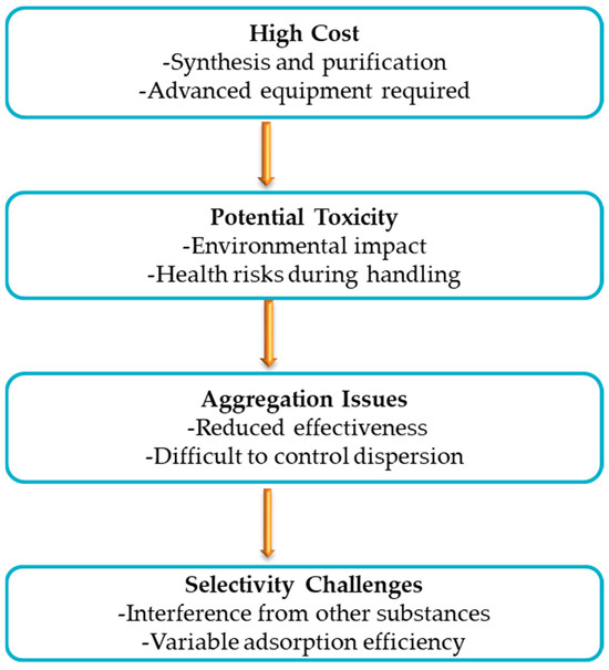 The vast porosity and large surface area of activated carbon are well known for their ability to effectively absorb a wide spectrum of organic contaminants, including PAHs [73]. However, iron oxide nanomaterials offer several advantages over activated carbon [70,74]. The magnetic properties of IONs, particularly magnetite and maghemite, allow for easy separation from treated water using an external magnetic field, reducing the need for additional filtration steps [35]. Moreover, iron oxide nanomaterials can engage in both physical adsorption and chemical interactions, such as surface complexation and π–π interactions, enhancing their overall adsorption efficiency and selectivity for specific contaminants like PAHs [27]. The main drawbacks of employing IONs to remove PAHs are depicted in Figure 2, including their high cost, possible toxicity, aggregation problems, and difficulties with selectivity.