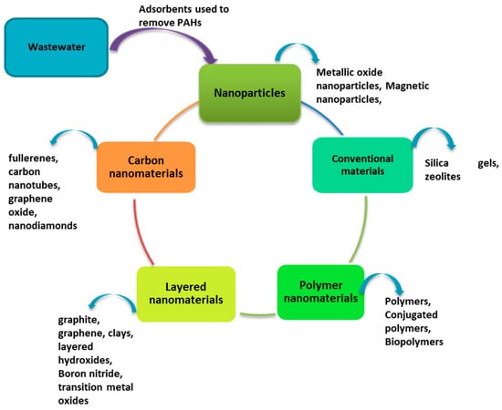 Due to the hydrophobic and persistent nature of these organic contaminants, treating wastewater-containing PAHs is a difficult procedure. A combination of chemical, biological, and physical techniques is usually used in effective treatment. Because of their large surface area and affinity for organic chemicals, activated carbon, IONs, and biochar are examples of physical approaches that can be used to adsorb PAHs from water [24,73,79]. Chemical therapies, including advanced oxidation processes (AOPs), break down PAHs into less toxic compounds by using potent oxidants like ozone, hydrogen peroxide, or photocatalysis. Utilizing microorganisms capable of metabolizing PAHs and converting them into non-toxic by-products is the biological therapy approach [43]. Bioaugmentation and biostimulation methods can be used to improve this bioremediation. By combining these techniques, removal efficiency can be maximized, and wastewater can be thoroughly treated. To preserve the environment and public health, PAH contamination must be properly addressed, which calls for strict monitoring and cutting-edge treatment techniques [49]. Different adsorbents for removing PAHs from wastewater are displayed in Figure 3.