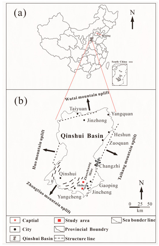 (a) Location of the Qinshui Basin in northern China. (b) Map of the Qinshui Basin and the location of the study area. Modified from Cai et al. [34].