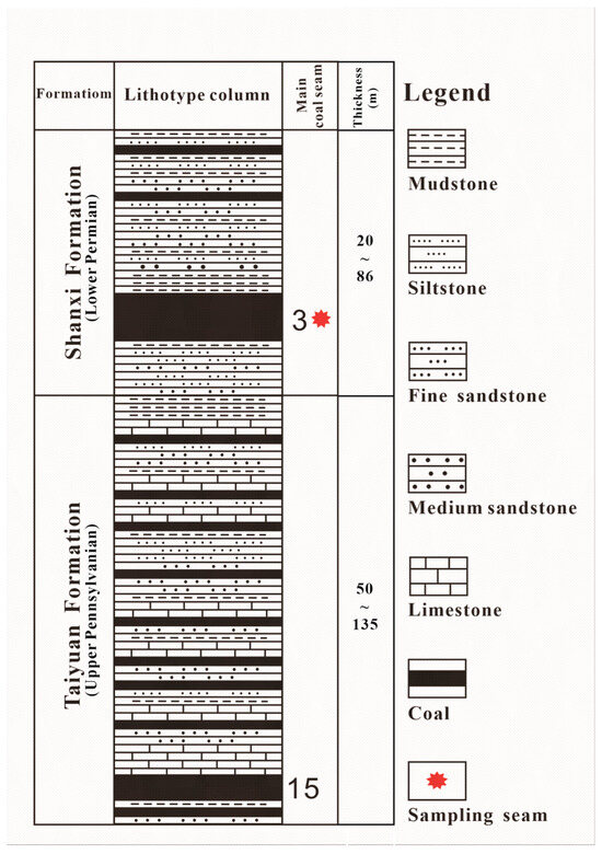 The stratigraphic columns of the Shanxi Formation (sampling seam). Modified from Li et al. [38].