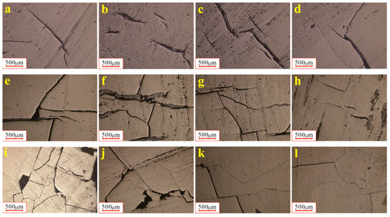 The characteristics of microfractures. (a–d) JC-1, the characteristics of microfractures, electronic microscope; (e–h) JC-2, the characteristics of microfractures, electronic microscope; (i–l) JC-3, the characteristics of microfractures, electronic microscope.