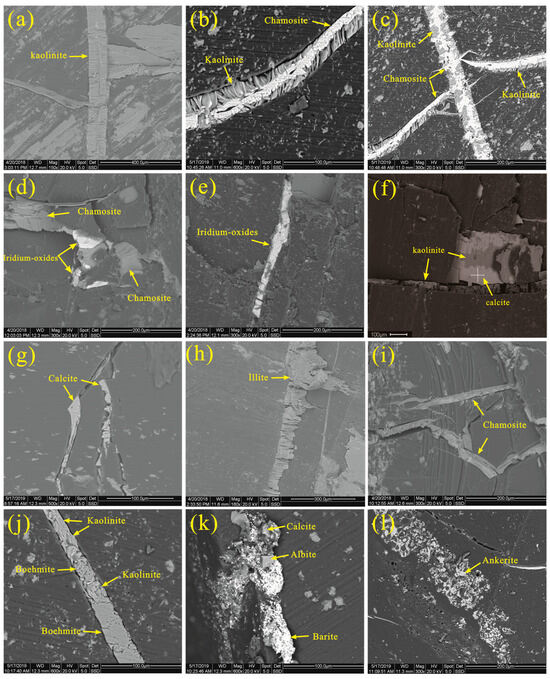 Under the SEM scale, the kaolinite mainly occurred as a fracture-filling (Figure 4a–c,f,j), such as filling fractures alone (Figure 4a) or co-existing with chamosite (Figure 4b,c), boehmite (Figure 4j), and calcite (Figure 4f), which indicated the formation of minerals was controlled by different stages of alternating fluid precipitation. In addition, a portion of kaolinite was distributed along the bedding planes (Figure 4a,f). However, the illite occurring as fracture-fillings and ankerite occurring as pore-fillings (Figure 4l) both suggested epigenetic formations (Figure 4h), although, below the detection limit of XRD, some minerals were detected via SEM. For example, albite occurred as individual particles and barite occurred as fine particles aggregates (Figure 4k).