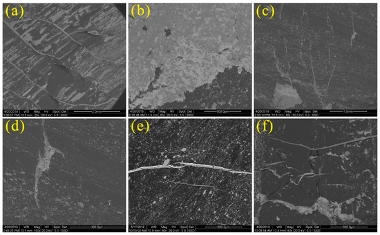 With a smaller amplification factor, the distribution of minerals in coal could be observed clearly. The minerals in primary coal mainly occurred as fracture-fillings (Figure 5a) and were distributed along the bedding planes in thin layers (Figure 5a,b). Additionally, the fractures were characterized by long lengths and fewer bifurcations. It also could be observed that some minerals occurred as pore-fillings (Figure 5d). Furthermore, the minerals in granulated coal were scattered in small clumps along the bedding planes or occurred as fracture-fillings (Figure 5e), and paragenesis developed well, which segregated coal structure into different-sized pieces (Figure 5f).