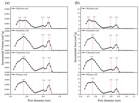 The micropore size distributions, incremental volume, and incremental surface area versus pore size of the tectonic coal samples obtained from the CO2 adsorption experiment are shown in Figure 7. As shown, the pore diameter of all samples was between near 0.40 and 0.90 nm, and the pore diameters between 0.48–0.62 nm and 0.8–0.9 nm were the main distribution area of pore volume and specific surface area with two significant peaks. In addition, the mylonite coal had two similar peaks between 0.48 and 0.62 nm, while in Figure 7b, the incremental surface area with the second peak showed a downward trend compared to the first peak at 0.50–0.60 nm. The phenomenon showed that tectonic deformation caused an increase in complexity [47], which suggested that the high temperature from the tectonic deformation made some micropores collapse, resulting in a decrease in specific surface area. At the same time, the volume of mylonite coal was lower than that of other samples, suggesting that a higher degree of tectonic deformation led to a significant reduction in micropores [18].