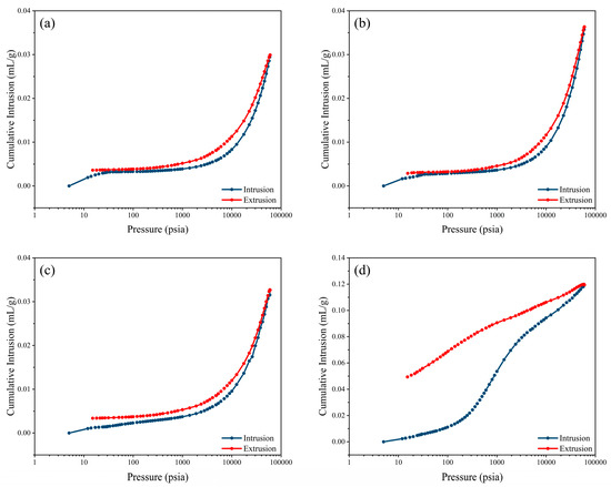 Figure 8 showed the mercury intrusion–extrusion curves for primary coal, cataclastic coal, granulitic coal, and mylonite coal. At the low-pressure stages, initial points of mercury intrusion are primarily due to macroscopic fractures between particles, which result from the coal sample or the sample preparation process [48,49]. These low-pressure points are usually disregarded in the study of pore fractures in coal. The mercury intrusion–extrusion curves for primary coal and brittle TDCs belonged to the parallel type [50], and their low-pressure mercury intrusion was minimal. At pressures above 10,000 psia, mercury intrusion increased significantly, and the withdrawal efficiency was high. In contrast, the mercury intrusion–extrusion curve for mylonitic coal had a pronounced change, belonging to the double S-type curve with a noticeable ‘hysteresis loop’. The mercury withdrawal efficiency was also lower due to the abnormal development of pores.