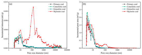 According to the IUPAC classification, the pore diameter distributions are listed in part of Table 5, and the incremental intrusion-pore size curves are shown in Figure 9. The mercury intrusion porosimetry mainly analyzed the pore characteristics of the mesopore and macropore stage of the coal samples. As shown in Figure 9, the pore volume of primary coal, cataclastic coal, and granulated coal generally increased with the decrease in pore diameter and reached their peak at about 10 nm, as well as their pore-specific surface distribution. However, the mylonite coal had many more macropores than other samples and reach its peak at about 100 nm.