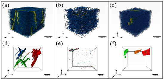 Three-dimensional visualization of the pores and fractures (Blue shading indicates the pores and yellow shading indicates the fractures in (a–c), different-colored shadings indicate different fractures in (d–f)).