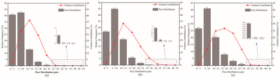 Distribution frequency of pore radius, JC-1 (a), JC-2 (b), and JC-3 (c).