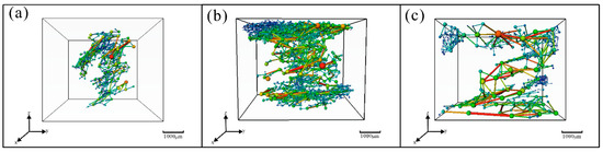 The model of interconnected porosity and pore network (JC-1 (a), JC-2 (b), and JC-3 (c)), the warmer the color of the pores and throats, the larger the diameter.