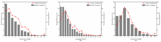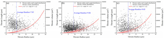 Distribution of pore throat radius, pore throat length, and cumulative volume contribution relationship (a–c).