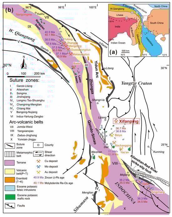 (a) Distribution of principal continental blocks and sutures of the east Tethyan belt (modified from []). (b) Tectonic framework of the Sanjiang region in southwest China, showing the major terranes, suture zones, arc volcanic belts, Cenozoic igneous rocks, and Cenozoic porphyry Cu–Mo–Au deposits (modified from [,]). The ages of the zircon U–Pb and molybdenite Re-Os for the porphyry-skarn ore belt in western Yunnan are from [].