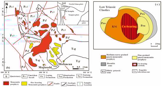The mining area is underlain by clastic rock series of the Upper Permian Leping Formation and Lower Triassic Qingtianbao Formation. Hundreds of porphyry intrusions have been found in this area (Figure 2a) in the form of dikes, with the size of the porphyry bodies generally less than 0.5 km2. Quartz monzonite porphyry and minor vein-like quartz syenite porphyry, lamprophyre dikes, and dioritic porphyrite account for most of the types of rock []. Biotite quartz monzonite porphyry comprises the main ore-forming rocks, intruding a Permo–Triassic clastic sequence with hornization alteration. The Cu (Au) ore bodies are mainly situated within or outside of the contact zone between the mineralized porphyry bodies and wall rock (Figure 2b).