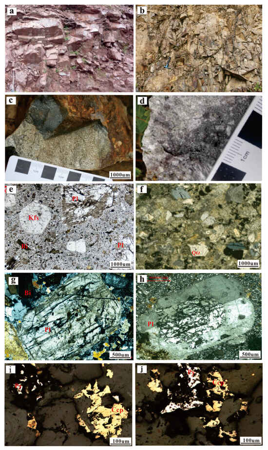 Representative photographs and photomicrographs of rock samples of the Xifanping deposit. (a,b) Outcrop of monzonite porphyry intrusions in the field; (c,d) Fine-grained and medium-grained monzonite porphyries samples; (e,f) Major rock-forming minerals in ore-bearing porphyry (plane-polarized light); (g,h) The plagioclase phenocrysts appear as subhedral and polysynthetic twins with partly sericitization (cross-polarized light); (i,j) Veined chalcopyrite and pyrite in monzonite porphyry (reflected light). Abbreviations: Pl: plagioclase; Kfs: potash feldspar; Bi: biotite; Otz: quartz; Py: pyrite; Ccp: chalcopyrite.