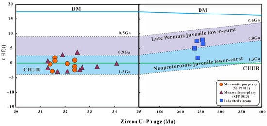 Furthermore, there is significant evidence to trace the magma source from zircon Lu–Hf compositions [,]. The values of zircon εHf(t) for the porphyry rocks range from −2.94 to +3.68 and from +1.83 to +7.98. The crustal model ages (TDM2) range from 0.88 to 1.30 Ga and from 0.77 to 1.17 Ga. These results are consistent with a source from the Neoproterozoic and Late Permian magmatic arc basement (Figure 7), which supports the findings of previous research. Hou et al. (2017) [] and Zhou et al. (2018) [], for example, found that the Neoproterozoic and Late Permian were the primary periods during which a thickened juvenile lower crust formed under the western margin of the Yangtze craton. The geochronological data reveals that the western margin of the Yangtze craton had an early magmatic arc basement and that potential sources of the Cenozoic porphyry magmas at the Xifanping deposit include juvenile lower crust materials of this early magmatic arc.