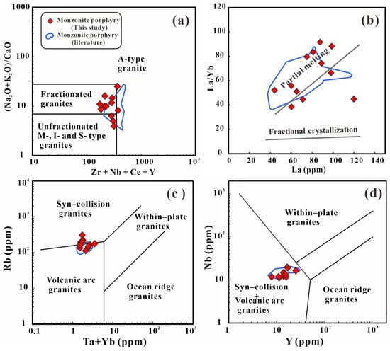 (a) (Na2O + K2O)/CaO vs. Zr + Nb + Ce + Y []; (b) La/Yb vs. La diagrams for porphyry rocks from the Xifanping; Tectonic discrimination diagrams for the Xifanping porphyry rocks. (c) Rb vs. (Ta + Yb) diagram []; (d) Nb vs. Y diagram []. The monzonite porphyry literature data are from [,].