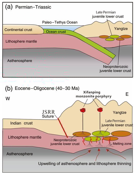 During the Paleo-Tethys oceanic plate subduction (~250 Ma), the initial accumulation in the lower crust and early continental magmatic arc were formed at the Yangtze plate’s western margin. The lower crust of the arc was underplated by juvenile mafic rocks (Figure 9a). During the collision between the Indian and Asian plates in the Cenozoic (~55 Ma), the subducted Indian continental lithosphere was torn into several pieces, which created an upwelling of hot asthenosphere through these slab-torn windows []. As the upwelling of the asthenosphere continued, the thickened lithosphere delaminated, and the subcontinental lithospheric mantle thinned, which caused crust extension [,].