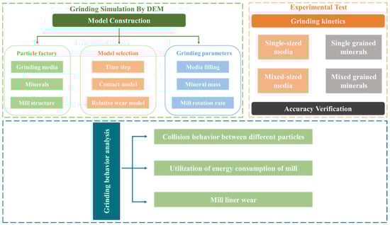 As depicted in Figure 2, the first step is to synchronize the simulation models with the batch grinding experimental results under identical conditions, ensuring that the simulations accurately replicate real-world grinding behavior. Following this synchronization, the critical breakage energy for various particle sizes is calculated, establishing a baseline for further analysis. Subsequently, simulation experiments are conducted for two scenarios: one involving mixed ball diameters with narrow particle size fractions and another with mixed ball diameters across a broader range of particle sizes. These experiments allow for an in-depth analysis of the collision behavior between different particles and the grinding media. By evaluating the magnitude and frequency of the energy generated during these collisions, the underlying grinding impact mechanisms can be identified, offering insights into how variations in particle size distribution and ball size influence grinding efficiency. Lastly, an assessment of liner wear is performed, focusing on both tangential and normal wear under various conditions. This provides a thorough understanding of how different grinding configurations impact liner durability and overall maintenance requirements.