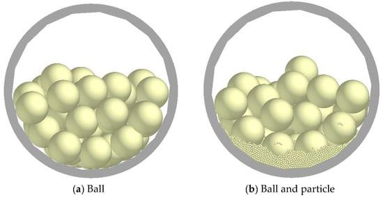 For steel ball sizes, different ball diameters are selected based on fixed particle sizes; for narrow particle size fractions, a fixed size range is chosen, generating minerals of −10 + 5 mm and −5 + 2.5 mm particle sizes. Additionally, the operational conditions of the mill are added to simulate the actual motion process. The generation time for both media and mineral particles is set to 1 s to ensure stable particle generation, as shown in Figure 3. The grinding simulation lasts for 10 s, with a total simulation duration of 12 s to ensure particles have enough time to achieve stable operation within the mill.