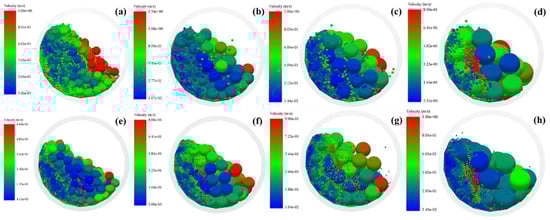 The influence of particle size on flow dynamics. (a) 5 mm–19 mm, (b) 5 mm–26 mm, (c) 5 mm–31 mm, (d) 5 mm–42 mm, (e) 2.5 mm–19 mm, (f) 2.5 mm–26 mm, (g) 2.5 mm–31 mm, (h) 2.5 mm–42 mm.