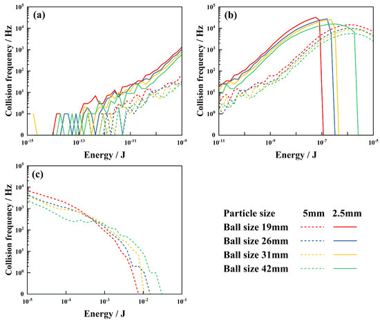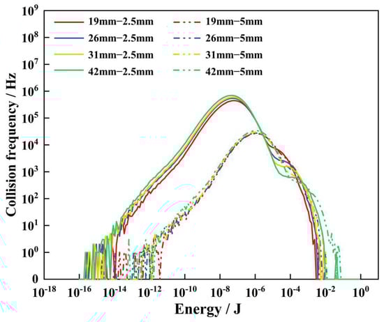 Considering that B-P is the primary source of mineral breakage in the grinding process, the mineral particle size is divided into two categories: 5 mm and 2.5 mm, with a composition ratio of 40% to 60%, as shown in Figure 8. It is evident that there are significant differences in the collision behavior between the two mineral particles and the medium. Specifically, the collision energy of the 2.5 mm mineral particles gradually increases within the range of 10−15 to 10−7 J, and the collision frequency at the same collision energy is higher than that of the 5 mm mineral particles. Moreover, with the increase in medium size, the collision frequency of B-P shows an increasing trend. Therefore, it can be concluded that the collision between the 2.5 mm mineral particles and the medium mainly occurs at a low collision energy below 10−7 J. On the other hand, the collision energy range between the 5 mm mineral particles and the medium is broader, extending from 10−2 to 10−1 J, and the collision energy at the highest collision frequency is higher than that of the 2.5 mm mineral particles at the highest collision frequency. Similarly, as the medium size increases, the collision frequency between the 5 mm mineral particles and media also shows an increasing trend. Furthermore, for the 2.5 mm mineral particles, not only is the collision frequency influenced by the medium size, but the collision energy at the maximum collision frequency also increases with the increase in medium size. However, this phenomenon is not observed in the case of 5 mm mineral particles.