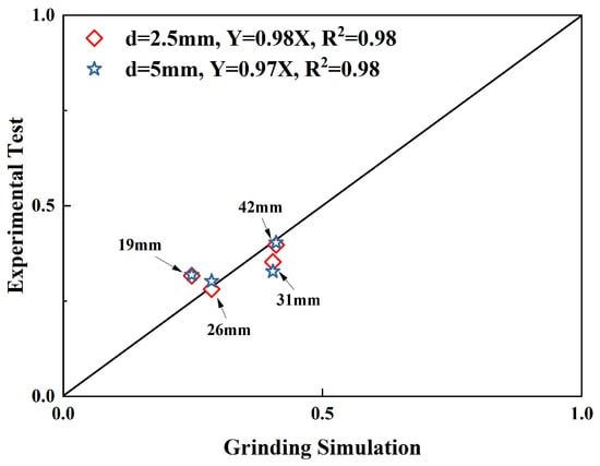 As depicted in Figure 6, the comparison presented here showcases the grinding rates obtained through two methods: the experimental test by Ma and the grinding simulation. It is evident that for 2.5 mm and 5 mm minerals [24], the application of different size media for linear fitting of the grinding rates results in fitting formulas of Y = 0.98X and Y = 0.97X, respectively, with a remarkably high fitting degree of 0.98. This observation indicates that the data derived from the simulations are closely aligned with the experimental test. Furthermore, the determined Wmin for the 2.5 mm and 5 mm minerals both amount to 1.54 × 10−3 J/kg, while the fmat stand at 5.33 and 5.01 kg/Jm. Given that these parameters are intricately linked to mineral properties and possess less association with grinding conditions.