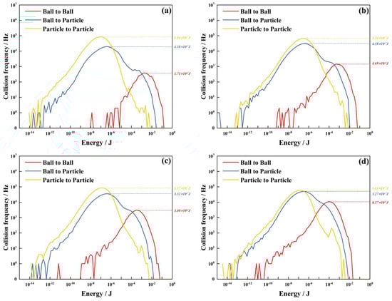 As shown in Figure 5, the distribution of collision energy between the medium and the mineral under different grinding conditions is illustrated. It is noticeable that particle size has a considerable impact on collisions, particularly for mineral particles. In comparison to 5 mm mineral particles, the collision probability between 2.5 mm mineral particles and the medium is significantly higher, with a broader range of collision energy distribution, primarily in the lower energy range. Once the collision energy exceeds 10−6 J, the difference between the two becomes minimal. Additionally, under the same grinding conditions, the medium size also exerts a certain influence on collision energy distribution. The size of the grinding media is the primary factor affecting the overall efficiency of a ball mill [25]. By optimizing the loading composition of grinding media within the ball mill, the specific surface area per unit of energy can be maximized, thereby enhancing grinding efficiency [26]. From Figure 5, it can be observed that as the size of the medium increases, the maximum collision frequency between the medium and the mineral gradually rises, and the collision energy here also increases with larger medium sizes, maintaining the same pattern for both narrow-sized minerals.